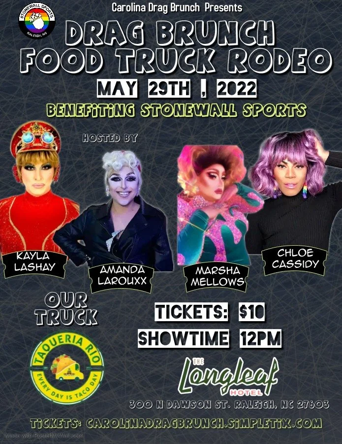 Carolina Drag Brunch returns! We’ll have food by Taqueria Rio and delicious drinks from our bar, all to benefit Stonewall Sports. Tickets available at carolinadragbrunch.simpletix.com.