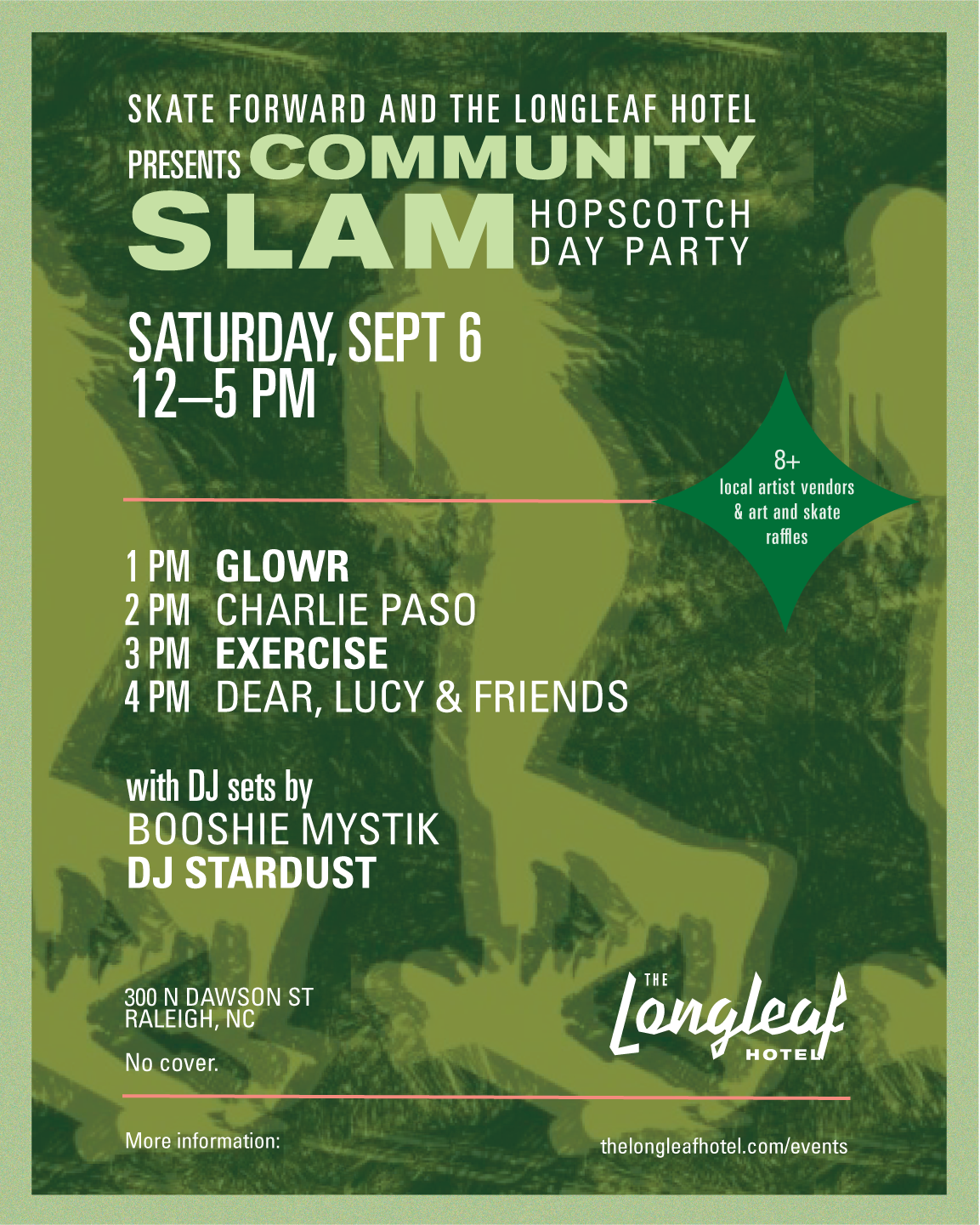 Skate Forward and The Longleaf Hotel presents Community Slam on the patio at Longleaf featuring performances by Glowr, Charlie Paso, Exercise, Dear, Lucy & Friends with DJ sets by Booshie Mystik and DJ Stardust. And 8+ local artist vendors and art and skate raffles. Join us this Hopscotch weekend for a high energy day party. All are welcome, no cover!