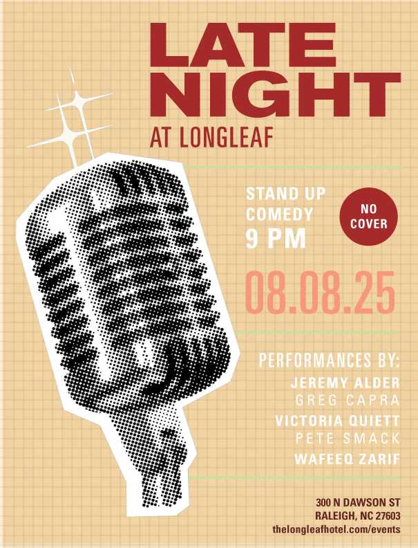 Join us on the patio for Late Night at Longleaf featuring stand up comedy featuring performances by Jeremy Alder, Greg Capra, Victoria Quiett, Pete Smack, and Wafeeq Zarif. Friday, August 8 starting at 9 PM. No cover.